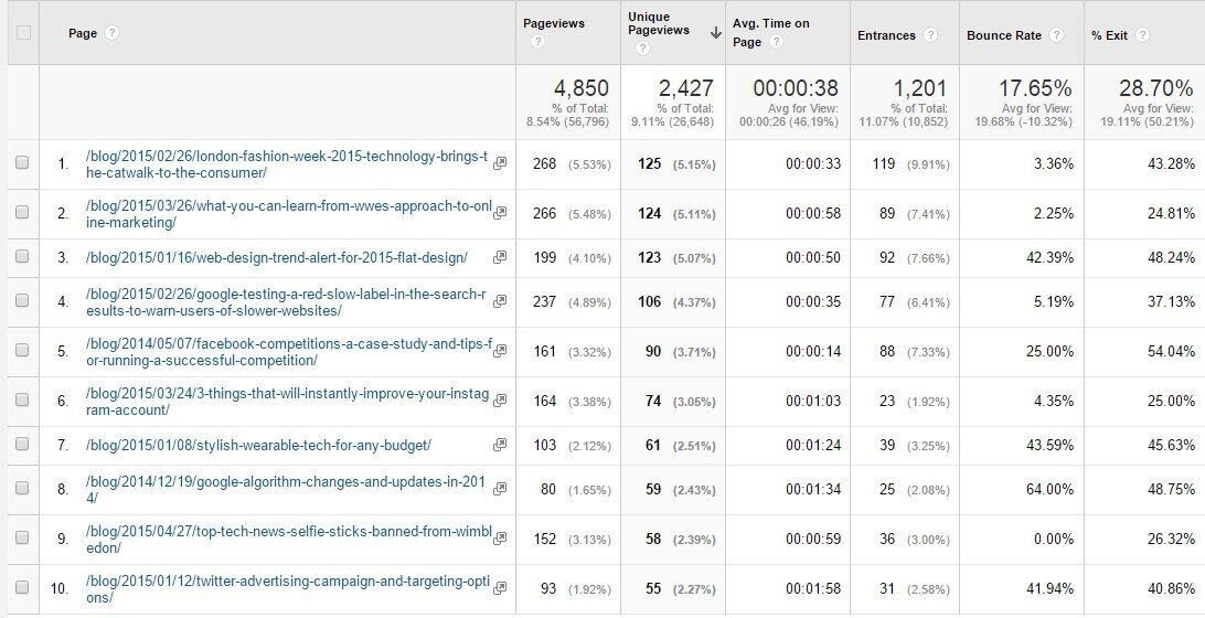 Here you will find a list of all the pages of your site that have been viewed during the date range you have set. If your page URLs don’t make it easy to understand which pages are being viewed, you can select “Page Title” (although it’s worth pointing out that if your pages have the same page title, the data will be combined)