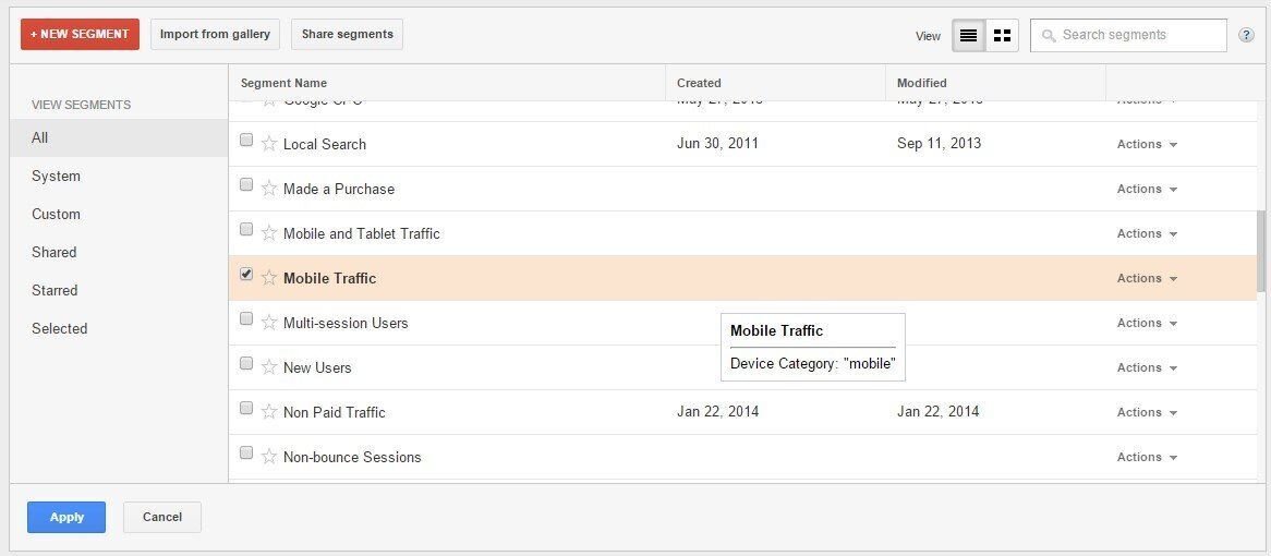 You can segment the data in many different ways to understand how different users are interacting with your content. For example you may be interested in seeing what pages users view when using a mobile device. To quickly do this, select “+Add Segment” which can be found below the data range and select “Mobile Traffic”. You can apply Segments to any report in Google Analytics.