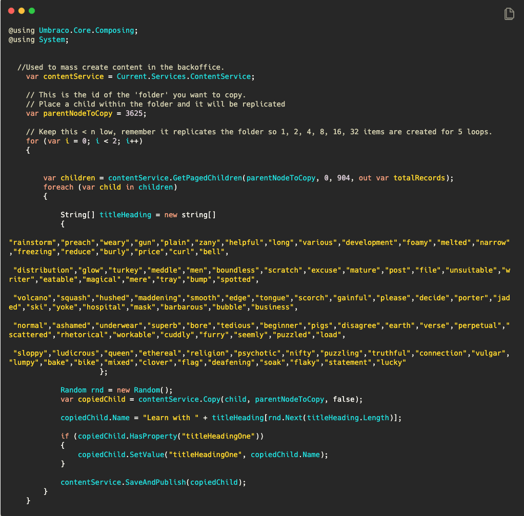 If there’s a need for adding a lot of data to a project to allow test pagination and filtering, previously, I would’ve added each content node manually. But, Nick suggested I script it to be reused for other parts of the project, too which sparked my thinking… how the heck would I do this and where do I begin?