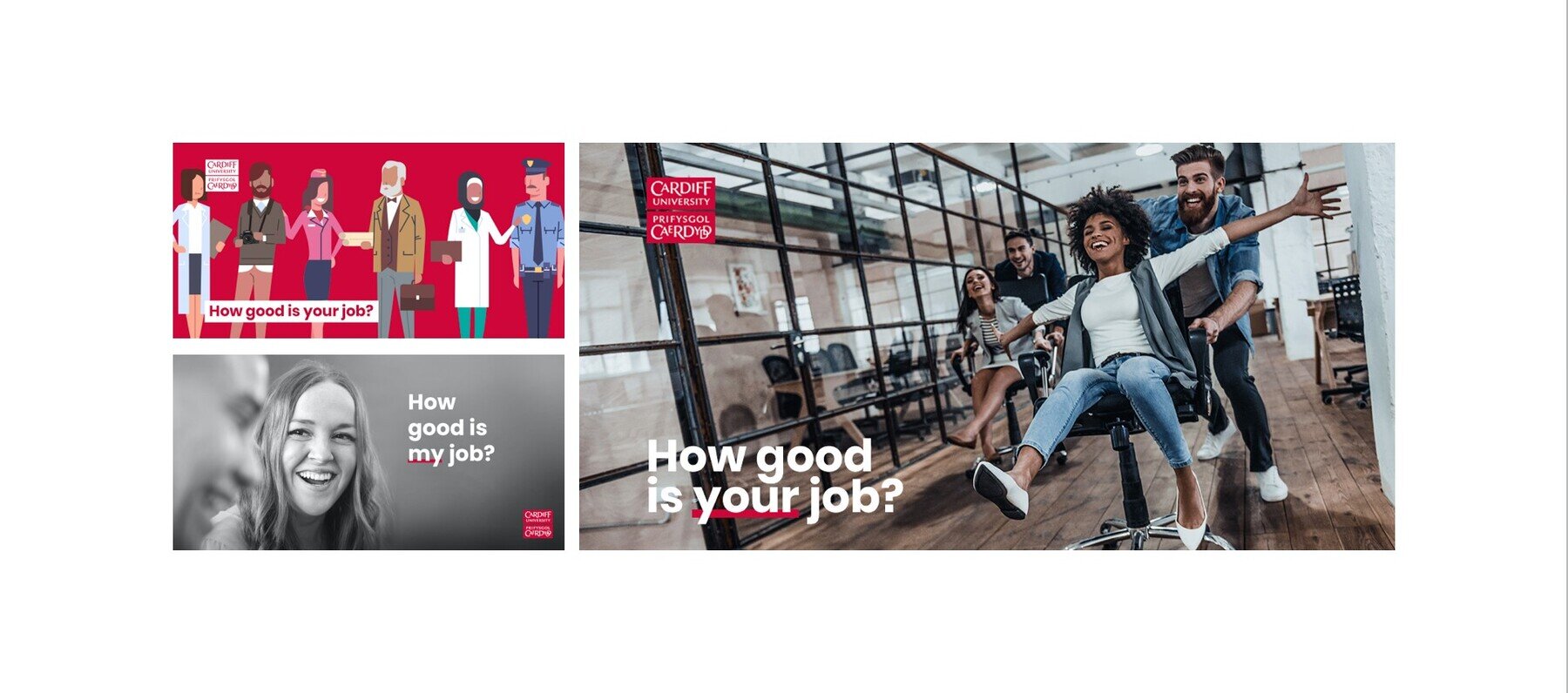 To start with, we needed images for the campaign that would engage our target audience. We ran a split test between three different visual styles (each with different copy) to see which one performed best. We chose photographs of older workers (30-50-year-olds), younger workers (18-25-year-olds) and an illustrated graphic depicting people in different jobs. We felt such a wide range of images would appeal to a variety of different audiences. Interestingly, we found that the illustrated graphic performed far better than either of the photos. As a result, Facebookâs algorithm chose it as the image used to promote the quiz going forward.