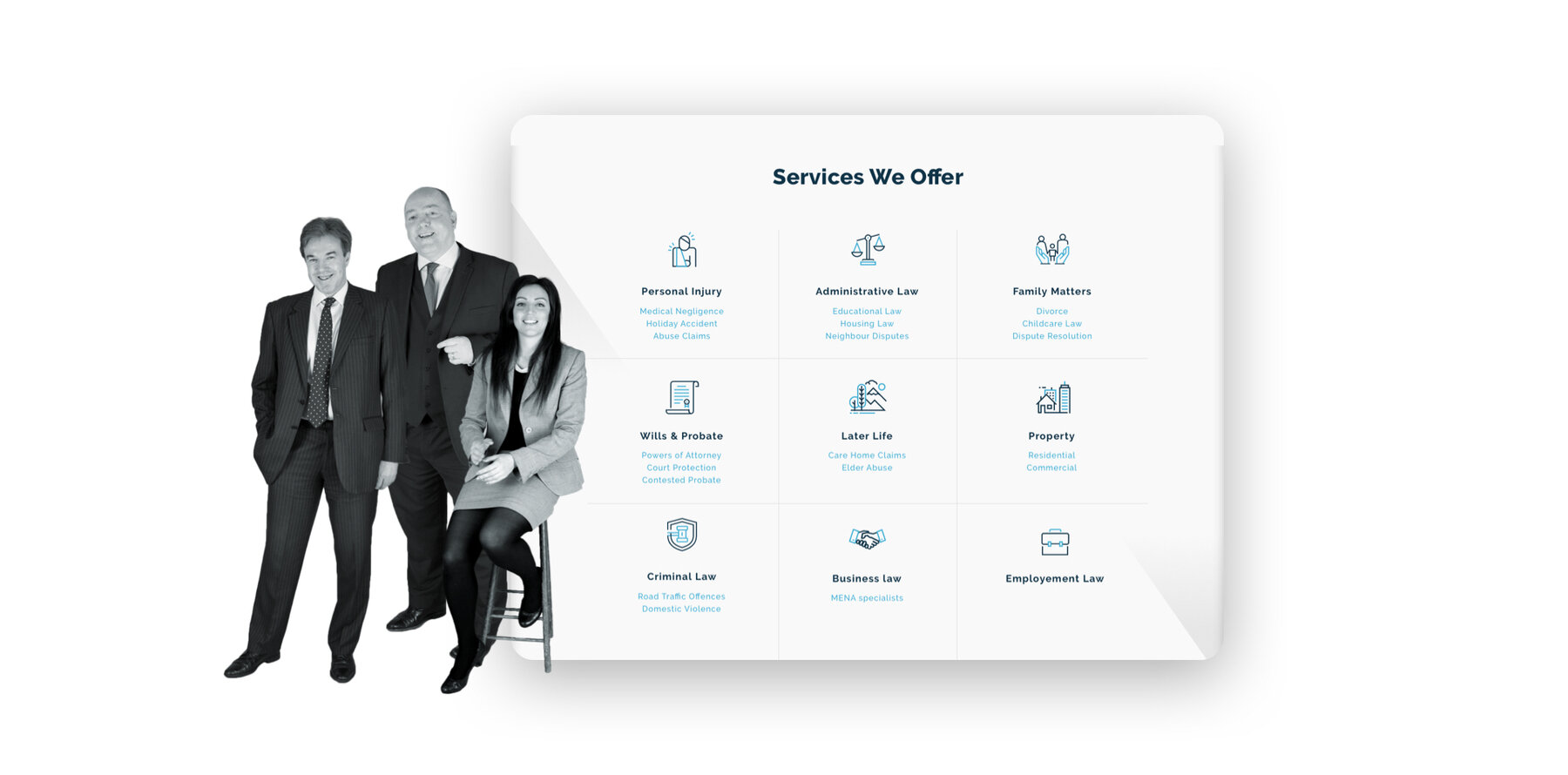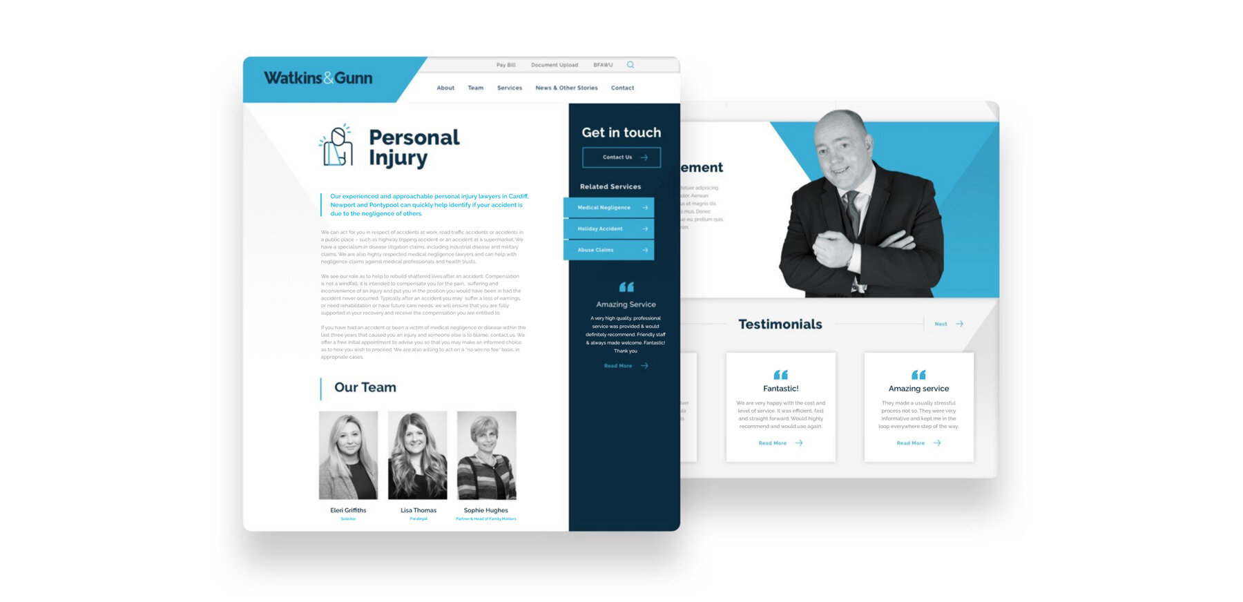 To highlight Watkins & Gunn excellent customer service, we added client testimonials to their home page. These are displayed in simple, square text boxes which users can click through to read. They also link through to photos of the team members that each testimonial is about, reinforcing that there are real, approachable professionals behind the website. This notion was also backed up by the implementation of a live chat function so users would be able to start a conversation with the firm in real-time.