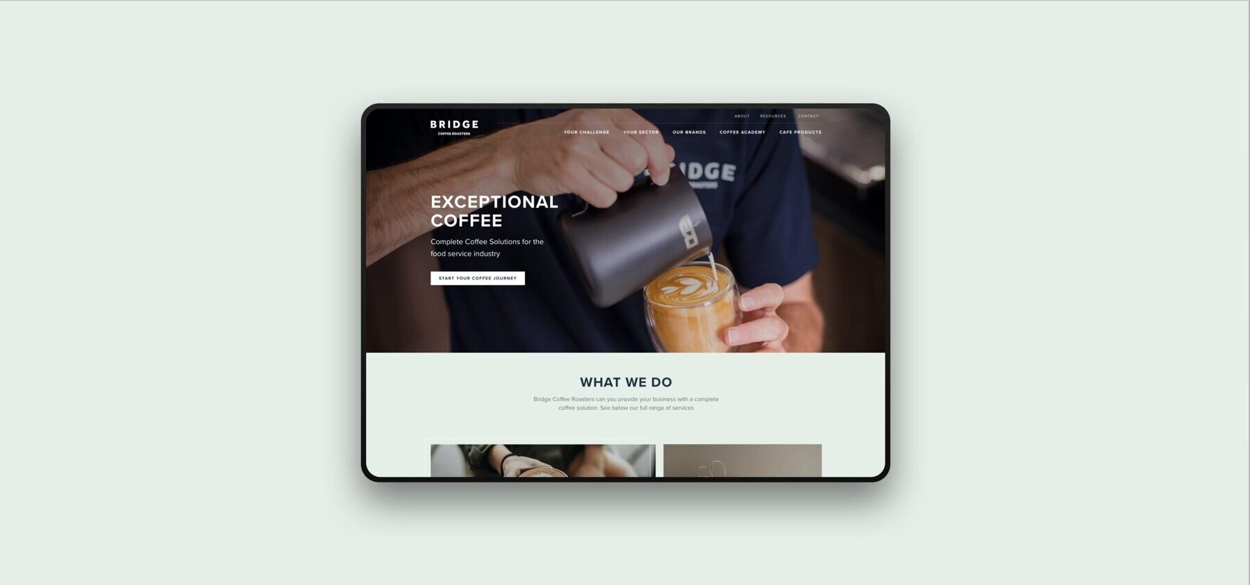 The main objective of the new website was to portray Bridge Coffee Roasters as professional, well established roasters who offer innovative coffee concepts and sell coffee experiences. As well as positioning Bridge Coffee Roasters correctly in the marketplace and highlighting their unique selling points, the site needed to act as a portfolio showcasing versatile previous work to prospective clients through case studies and testimonials.