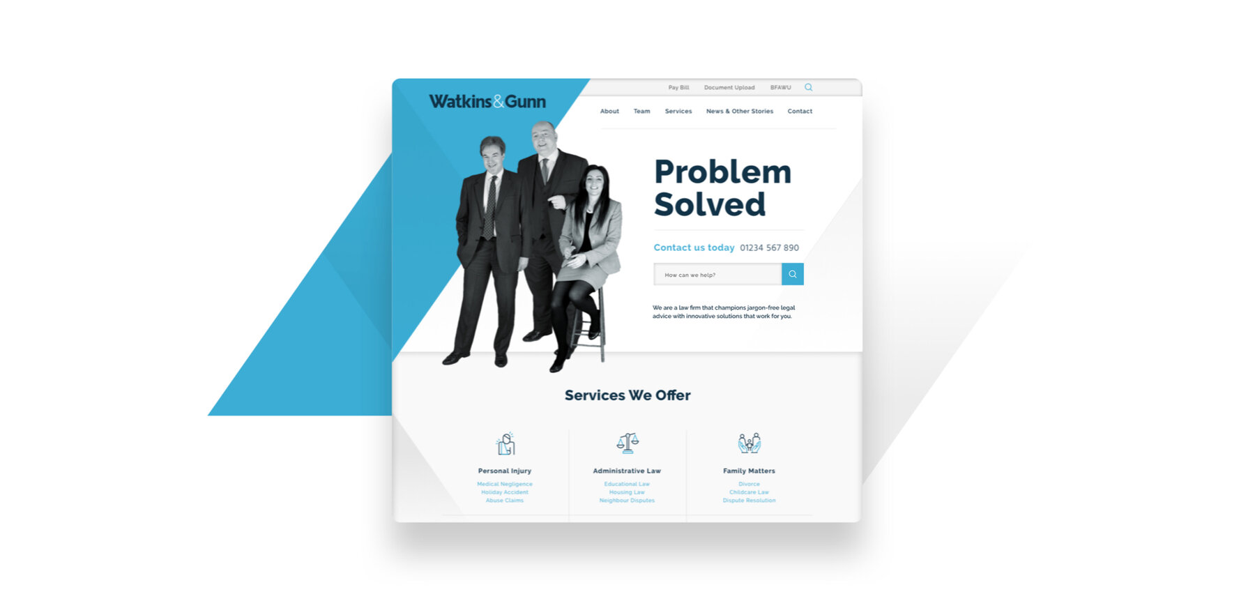 To highlight Watkins & Gunn excellent customer service, we added client testimonials to their home page. These are displayed in simple, square text boxes which users can click through to read. They also link through to photos of the team members that each testimonial is about, reinforcing that there are real, approachable professionals behind the website. This notion was also backed up by the implementation of a live chat function so users would be able to start a conversation with the firm in real-time.